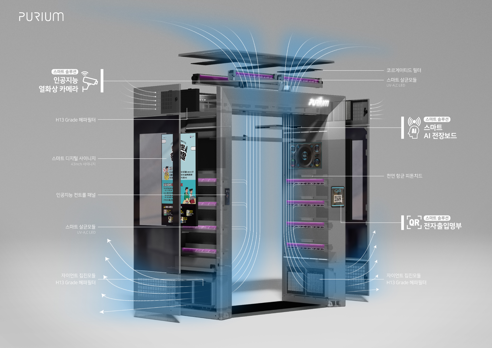 주식회사 퓨리움은 2016년 설립 이후 ‘사람이 안심하고 숨 쉴 수 있는 청정 공간’을 목표로 혁신적인 공기질 관리 솔루션을 제공하는 스마트 에어샤워 전문 기업입니다. 퓨리움은 세계 최초로 인공지능(AI)과 사물인터넷(IoT) 기술을 융합한 워크스루형 스마트 에어샤워를 선보이며, 건물 입구에서부터 미세먼지와 바이러스 등 유해 물질의 실내 유입을 원천 차단하는 독보적인 기술력을 보유하고 있습니다.